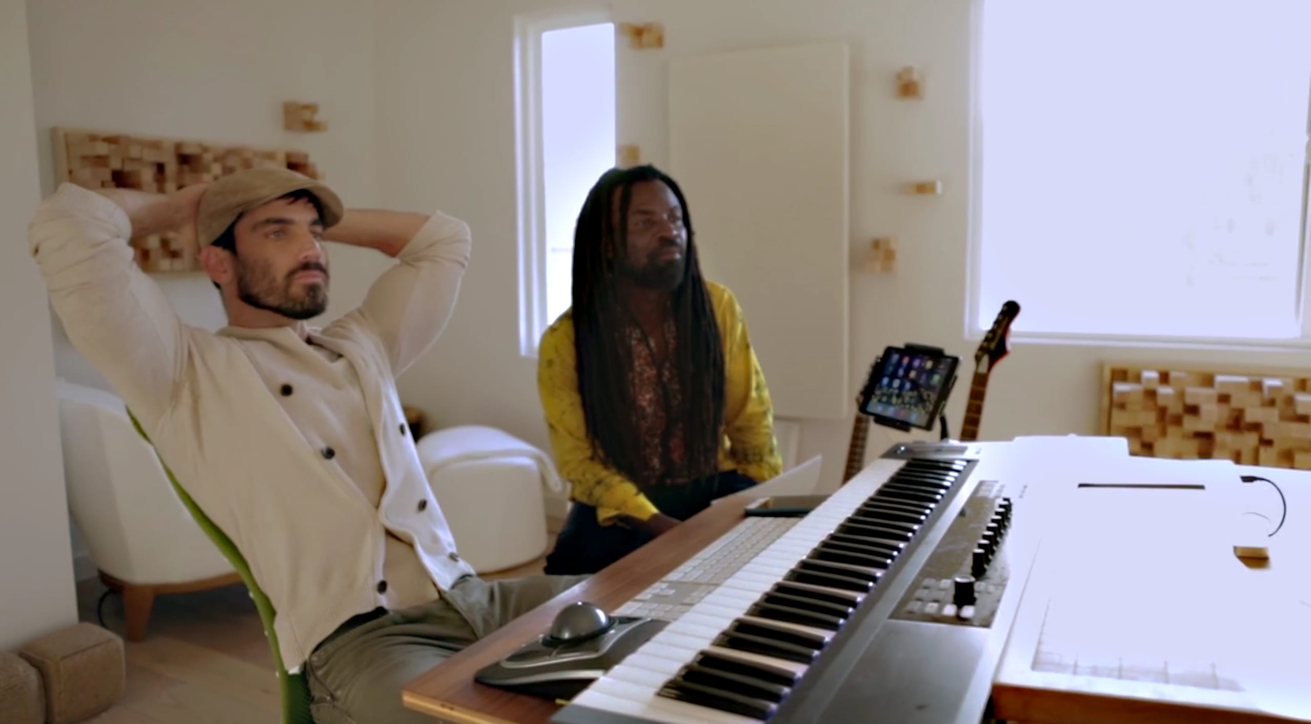 In the photo: Rocky Dawuni and Tom Erba listening back to the rough mix of “Peacefire.”