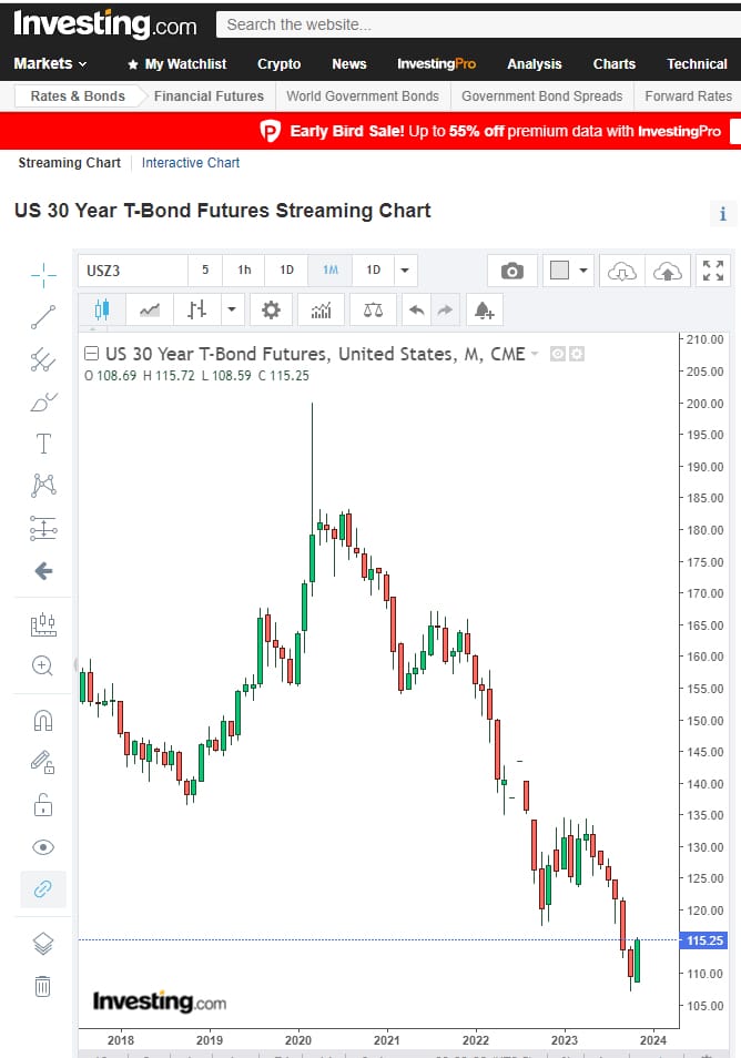 A sober-October crash in U.S. Treasuries prompted the Federal Reserve Bank to pause U.S. rate hikes, in turn inspiring bottom fishers to frolic back into the water and start buying up bonds again. Their exuberance can be seen in the formulation of a bullish engulfing pattern in bond charts, where the last up/green month engulfs the preceding red/down month, for the 5-year T-note future, the 10-year, and now even the 30-year T-note future.