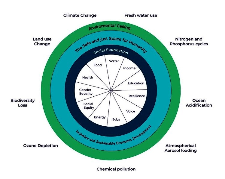 In this diagram (inspired by economist Kate Raworth’s model of Doughnut Economics), Climate PI presents an outer circumference that includes non-human climate phenomena as earth systems that must be in balance in order to create an “environmental ceiling” sufficient to sustain human life at every social level.