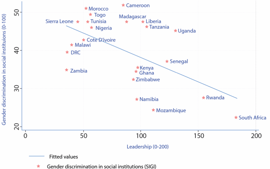 In Figure 1, we plot the index of gender discrimination in social institutions on the index of female political leadership to test if there is any correlation. The figure shows that countries with a higher level of female political influence, record lower levels of gender discrimination in social institutions. South Africa records the highest female political influence and also the lowest gender discrimination in social institutions.