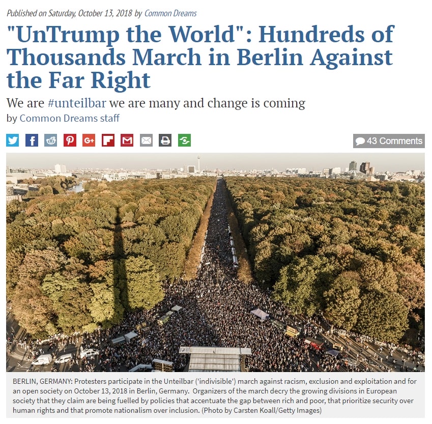 In the photo: Screenshot of Commons Dream article on the Unteilbar (“indivisible”) march in Berlin “against racism, exclusion and exploitation and for an open society”, 13 October 2018 Source: Common Dreams: “UnTrump the World”: Thousands March in Berlin against the Far Right (Germany)
