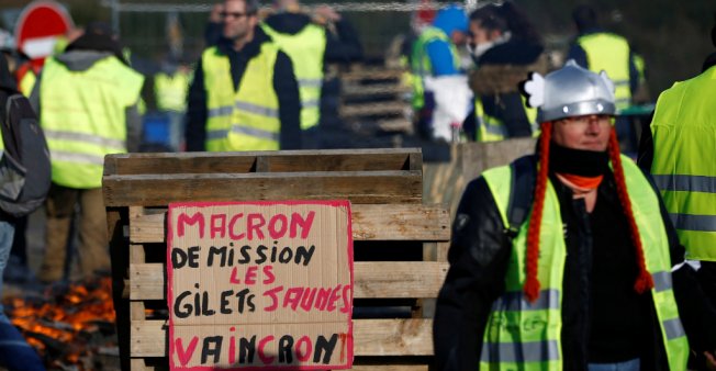 In the photo: Protesters wearing yellow vests, a symbol of a French drivers’ protest against higher fuel prices, attend a demonstration at the entrance of a shopping center in Nantes, France, on November 19, 2018. (France 24 news) Credit: Stephane Mahe, Reuters
