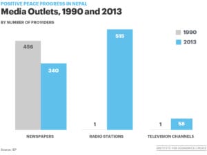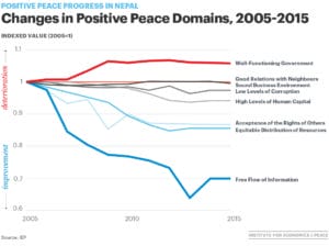 An apt case study here is Nepal. After a decade-long internal conflict, a Comprehensive Peace Agreement was signed in 2006 marking the cessation of violence. The majority of violence stopped. Anyone could note that in comparison to the years before, Nepal was peaceful. Nepal was characterised by the presence of Negative Peace. In order to sustain a society resistant to the threat of violence, investment in Positive Peace is necessary. The Nepalese progress towards Positive Peace was driven by focusing on the weakest pillar: Free Flow of Information. This impacts how informed citizens are, and the rationality that crises are responded to with.
