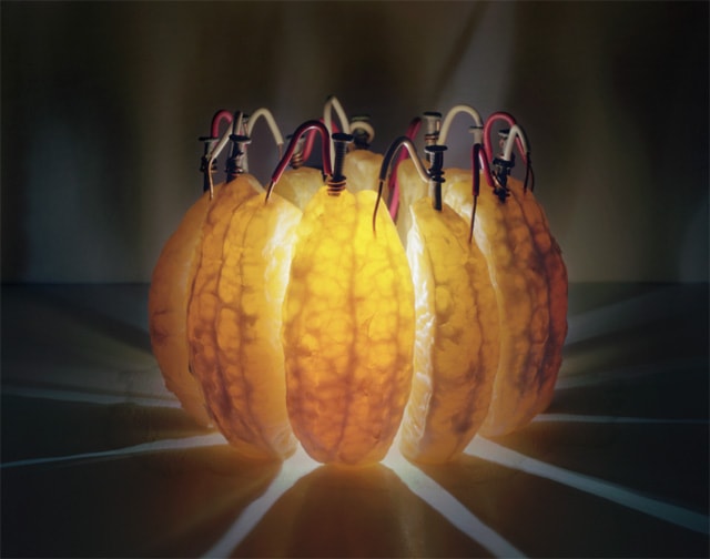 The american artist uses nails inside fruit connected with copper wire to create functional batteries. Harnessed to a small lightbulb, the current is enough to provide illumination for long exposure photographs. The organic batteries create enough voltage to illuminate them.