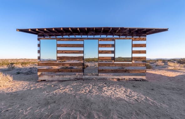 Upon further viewing, Lucid Stead imposes a delirious, almost spiritual experience. Like the enveloping vista that changes hue as time passes, Lucid Stead transforms. The old shack, that serves as the armature of the piece, reflects and refracts the surrounding terrain like a mirage or an hallucination. As the sun tucks behind the mountains, slowly shifting, geometric color fields emerge until they hover in the desolate darkness.