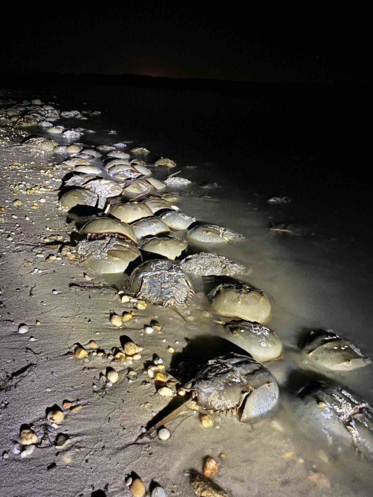 A new moon, it is almost midnight and I’m on a beach in Delaware, watching horseshoe crabs coming to the surf line to spawn. They are not actually crabs, but arachnids. Their closest biological relatives are ticks, spiders and scorpions. Their bodies flout all normal rules. They have ten eyes, or some say nine, some on their spiky tail. They look like helmets, some of their shells have crusts of barnacles or wafting wigs of seaweed.