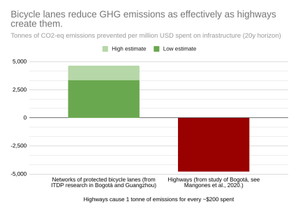 To achieve the same numbers in terms of emission reduction, cities would need to plant 300,000 to 400,000 new trees every year. In contrast, for every $200 spent on highways, 1 tonne of GHG emissions per year will be created. While the same spend on protected bicycle lanes would mitigate almost exactly the same amount