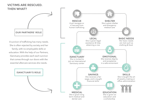 PURPOSE Jewelry is all handcrafted by these women and the proceeds of the jewelry go to International Sanctuary. International Sanctuary not only offers employment, but also education, health care and community for young women escaping human trafficking.
