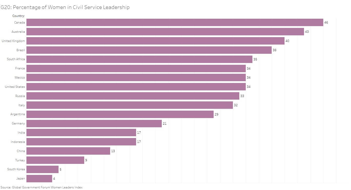 One organisation that has been tracking women in senior civil service roles is Global Government Forum, who, together with EY, have produced a Women Leaders Index each year since 2013. The index tracks G20 and European data, although the aforementioned issues with comparison complicate things. While G20 data measures women in the top five civil service grades, European data only measures the top two grades.