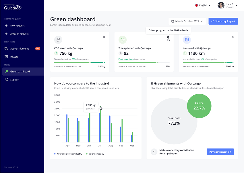 At any given moment, the company can track its footprint and performance in the green dashboard (picture attached). For every emission-free shipment, a “green certificate” is issued which can be shared with involved parties and stakeholders.
