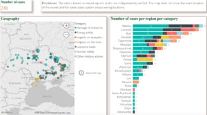The map tracks the environmental destruction from damage of industrial facilities, energy safety, impacts on ecosystems, impacts on the marine ecosystem, livestock waste, nuclear safety and other military actions.