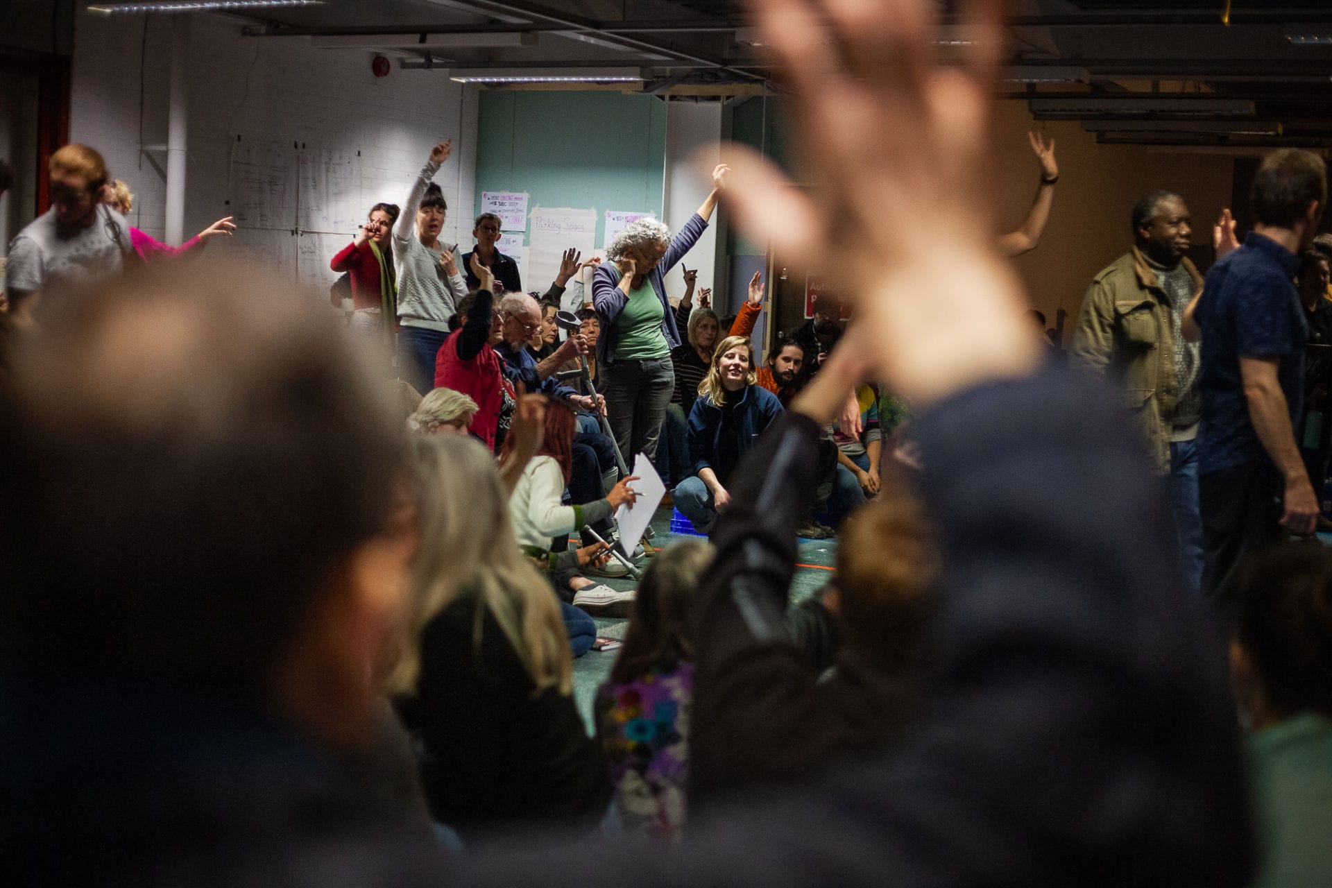 We gathered round designated tables for different working groups: media and messaging, action and logistics, outreach, and regenerative culture (tasked with making sure the rebellion stays emotionally and socially healthy and activists avoid burnout and internal conflicts). On the media table, it’s predictably awkward at first; no one really knows what to do, and we can hardly hear each other over the cacophony of voices in the room. It’s clear we’d need a high tolerance for messiness as Whatsapp and Signal groups were formed and skills established, before we get to the point of planning anything. But everything felt raw, molten, alive.