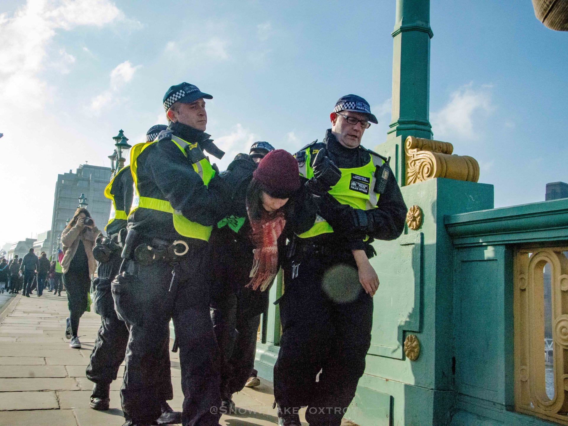 We told our girls we were going to the bridge to protect animals and they were disappointed not to see roaming lions and elephants as we approached Blackfriars. We were nervous, trying to act like tourists for now, sticking to the pavement, snapping pictures of the river, smiling, slipping into Portuguese when police walked past, so as not to attract attention. It turned out to be completely unnecessary and faintly ridiculous. There were far more police at this point than protestors. Taking the bridge looked impossible with these measly numbers. But gradually, a group cohered at a bus stop, pretending to wait for a bus. How could we be moved along or arrested for that? The XR website instructed us to “wait for the signal” to take the bridge, but no signal was forthcoming from anyone.