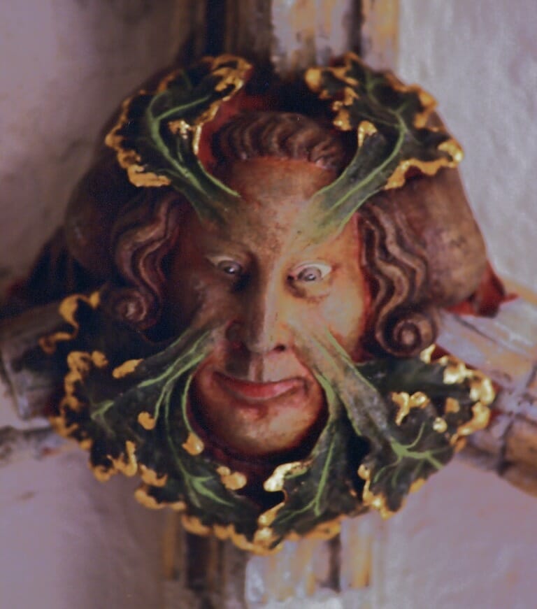 The Green Man represents the presence of the divine in nature. He radiates mysterious wisdom along with wry humor that we don’t often associate with religion. “As cosmic man or the personification of the intelligence in the tree of life,” writes William Anderson, “the Green Man is the point at which truth is manifested in creation, whether as life, light, song, words or the figurative forms.”