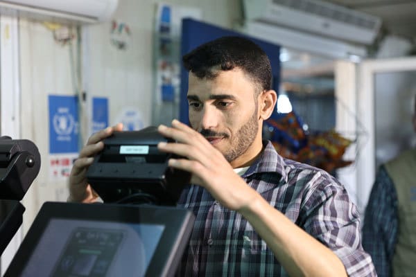 IN PHOTO: HAMADA, A SYRIAN REFUGEE FROM DARAA, LOOKS INTO THE IRIS SCAN CAMERA. PHOTO CREDIT: WFP/MOHAMMAD BATAH