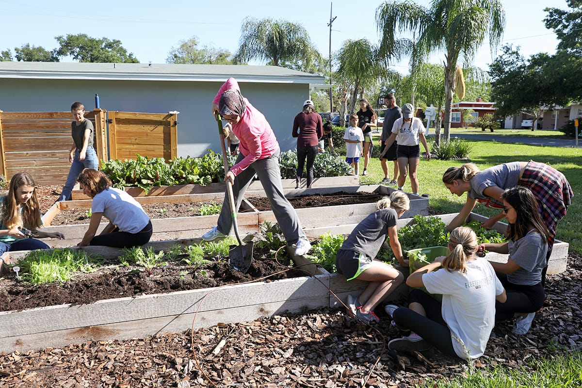 In the Photo: Fleet Farming achieves multiple SDGs. By turning lawns into farms and sharecropping with homeowners, Fleet Farming is able to generate a profit while reducing fertilizers and runoff, and teaching a community of volunteers how to farm organically. Photo Credit: IDEAS/Christopher Stampar