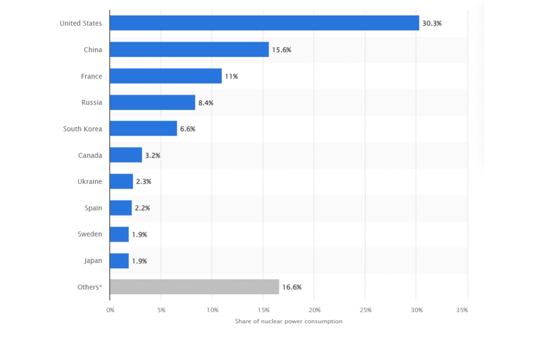 Nuclear power is used in more than 50 countries. Unsurprisingly, the USA is the biggest consumer of nuclear energy, followed by China, France, and Russia.