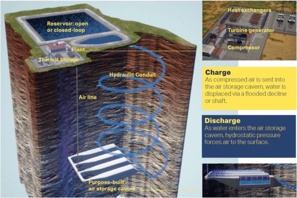 Curtis explained that while these zero-emission storage projects are large, from one hundred million to five hundred million in capital costs and two years to permit and build the site, they are a very reliable and cost-effective solution that stacks up well against the alternatives. Lithium-Ion batteries have caught on in recent years, but with multiple football fields of them all strung together, they are expensive and have to be replaced every 5 or 10 years. The traditional hydro-electric or “pumped-hydro” storage today makes up 97 percent of utility-scale energy storage in the United States, but is limited to areas with unique geographic features like two lakes next to one another, with one more elevated than the other.