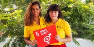 IN THE PHOTO: Pollinate Energy City Co-leaders Meenal and Eloise promoting Gender Equality, one of the official 17 Sustainable Development Goals. PHOTO CREDIT: Pollinate Energy