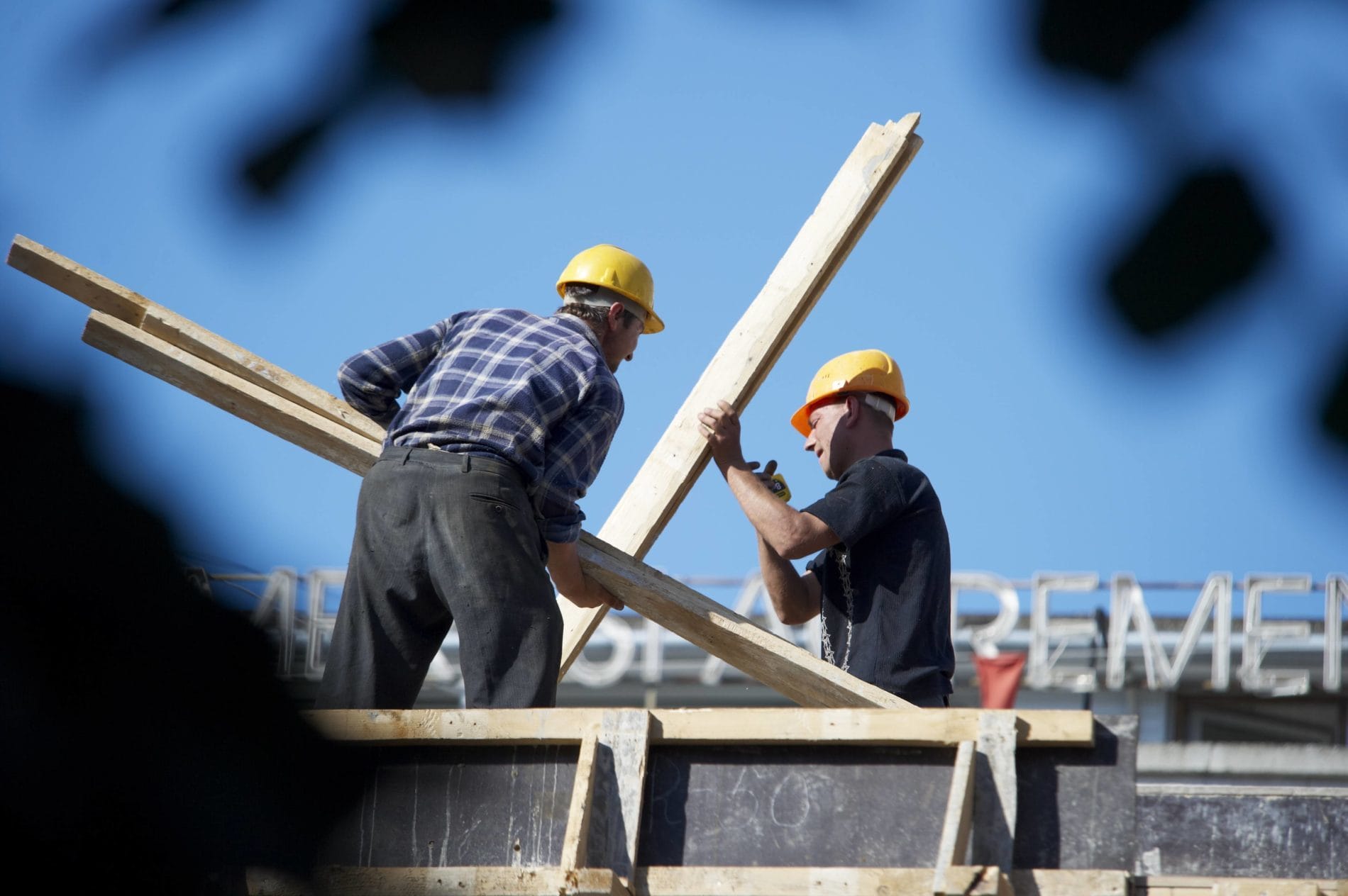 In the Photo: Construction workers lifting planks of wood Photo Credit: European Training Foundation