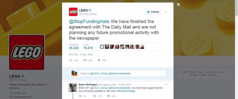 Stop Funding Hate’s big breakthrough came three months into the campaign. In November 2016, amid ongoing concern about the media’s behavior, a Stop Funding Hate supporter named Bob Jones wrote a heartfelt message on the Facebook page of Lego, one of the Daily Mail’s big promotional partners: