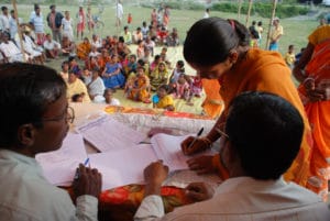 IN THE PHOTO: A previously landless woman in West Bengal, India, signs to receive a title to her own plot of land. In India and elsewhere, governments are putting women’s names on title documents to improve gender equality in land rights. PHOTO CREDIT: Landesa