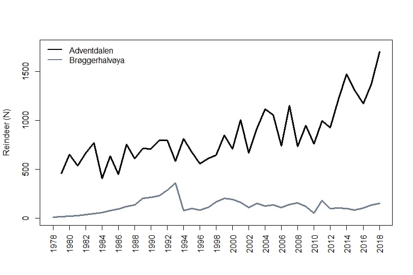 In Brøggerhalvøya, reindeer were extinct for a century before 15 were reintroduced in 1978. FifTheir population kept increasing until a rainy winter in 1993-94 that prompted a crash in reindeer numbers. Since then, the population has stayed stable at lower numbers.