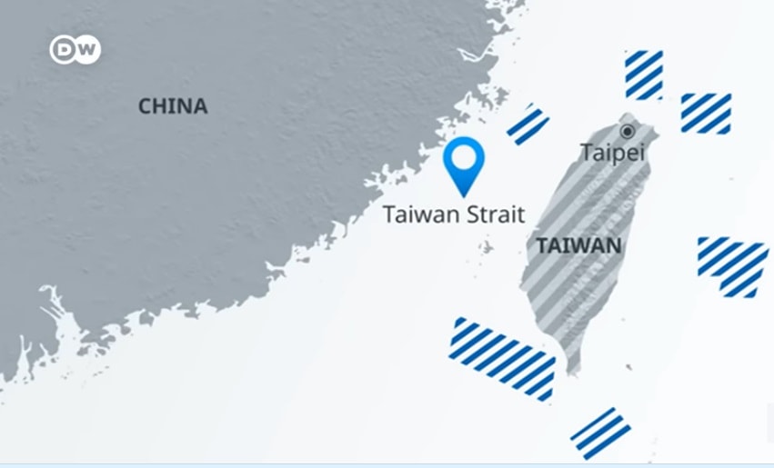 What is most concerning about these Chinese military exercises is that — also for the first time — they are carried out with live ammunition, which means that at anytime the exercises can be converted into an instant attack; and, being closer than ever to Taiwan, missiles for the first time have landed in Japan’s economic zone. Here is a map of the areas hit by Chinese missiles (screenshot of DW video):