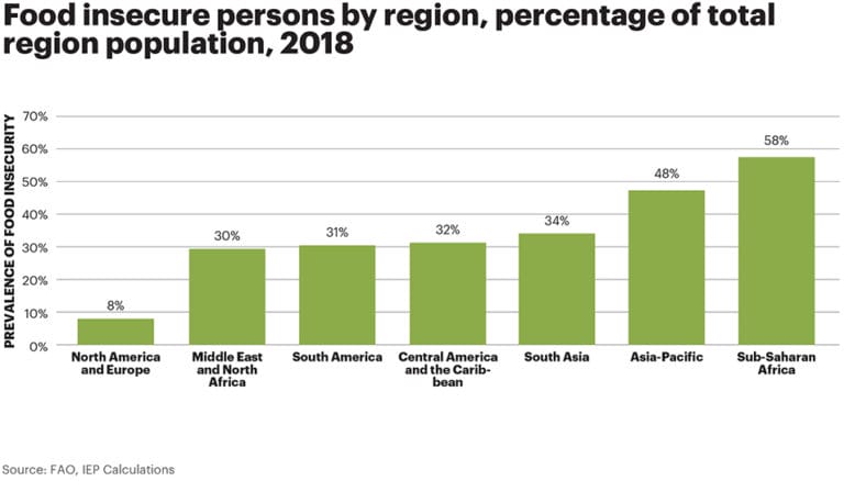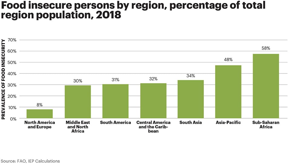 Food insecurity and peacefulness have a strong statistically significant correlation. The prevalence of food insecurity increases as countries experience deteriorations in safety and security, internal peace or increases in violent crime. The strong relationship between peacefulness and food insecurity highlights that less peaceful countries have a higher prevalence of food insecurity.