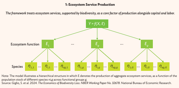 Figure 1 illustrates how biodiversity drives the production of ecosystem services. The first layer of Panel 1(a) shows how aggregate ecosystem services are produced by the interaction of distinct, complementary functions — some provisioning goods (e.g., food, fuel, timber, medicines) and others regulating processes (e.g., pollination, water purification, carbon storage). Because these functions are complements, losses in any one reduce ecosystem services directly and indirectly, and are not easily offset by improvements in others. For example, a loss in pollination cannot simply be replaced by better water filtration or sanitation. Since ecosystem services complement land, labor, and capital, their decline can lower economic output even when these other inputs increase.