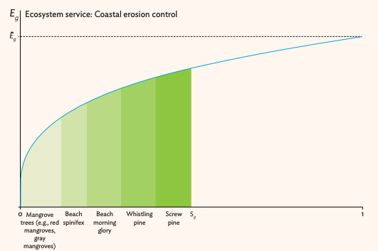 Figure 1(b) illustrates this mechanism for coastal erosion protection, which is provided by partially substitutable species such as mangroves and screw pines. Starting from a very biodiverse ecosystem (i.e., to the right of the graph), the loss of some species has only limited effects on total production (the slope is flatter there). However, losses in biodiversity also make the ecosystem more fragile to further losses (the slope steepens as more and more biodiversity is lost): the ecosystem becomes more fragile. Because ecosystem services are an important input to the economy, increased ecological fragility exposes the economy to potentially severe losses.