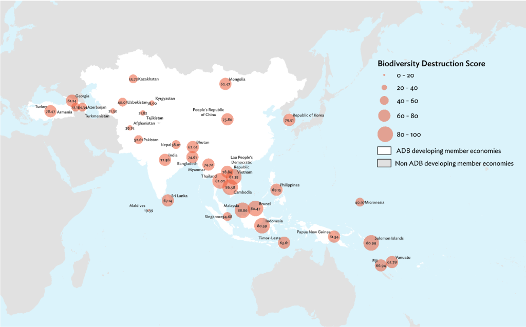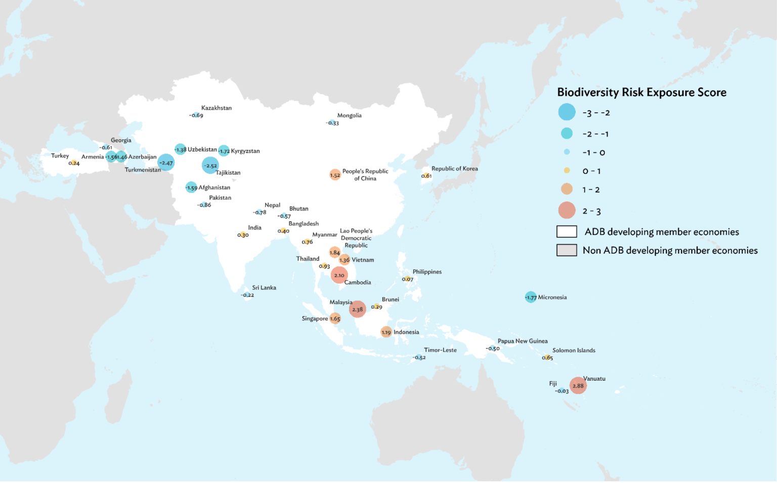 Exposure to biodiversity loss varies across regions. Figure 2(a) captures the overall scale of biodiversity loss across countries, while Figure 2(b) presents a biodiversity risk exposure score, which reflects how unevenly those losses are distributed across ecological functions. Countries such as Malaysia and Indonesia, where biodiversity loss is particularly severe, exhibit some of the highest exposure scores.