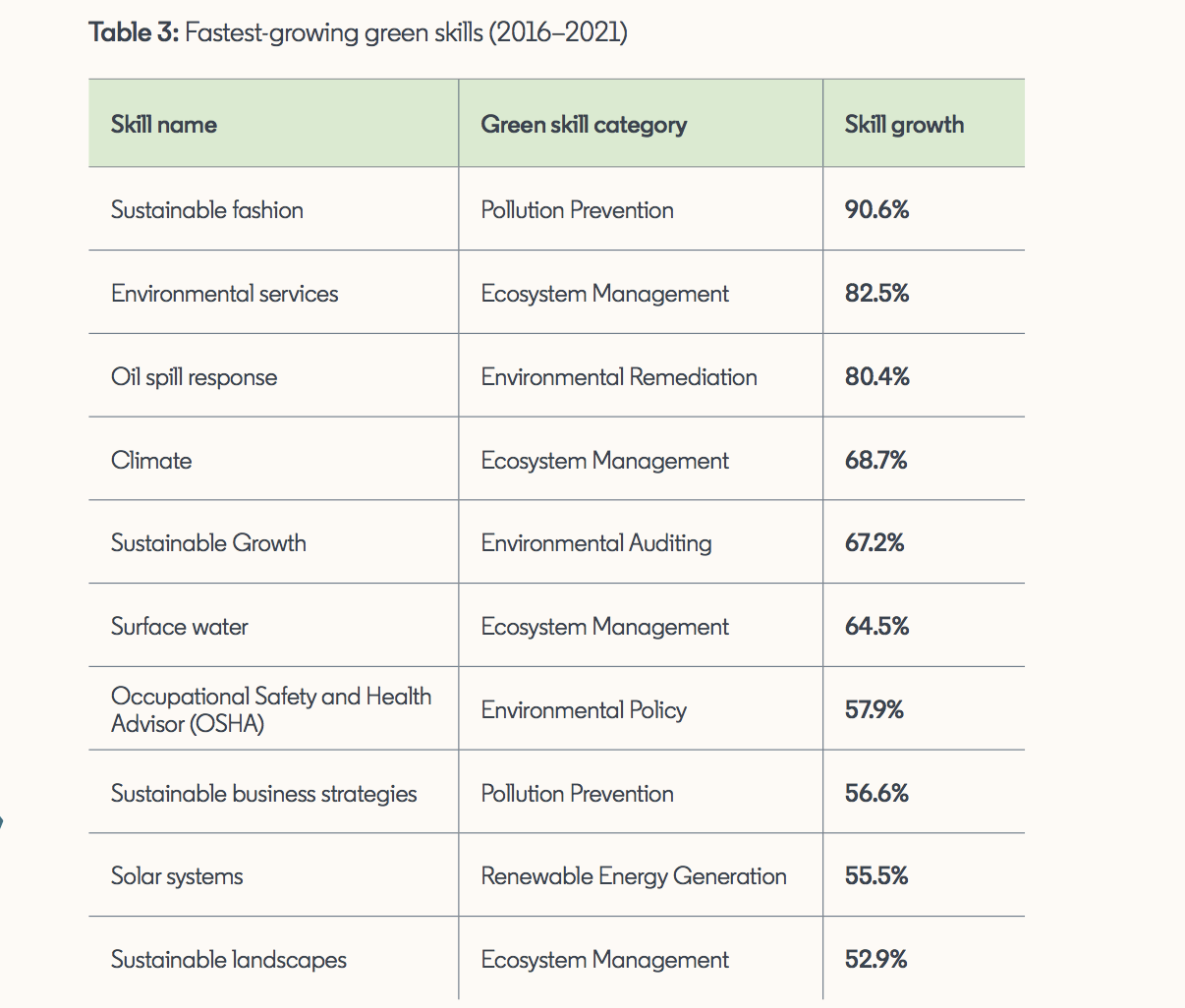 The report shows the fastest-growing green skills between 2016-2021 (see table below). According to LinkedIn, the high percentage of growth of some of these skills suggest the emergence of new trends such as Sustainable Fashion, Oil Spill Response, and Sustainable Business Strategies.