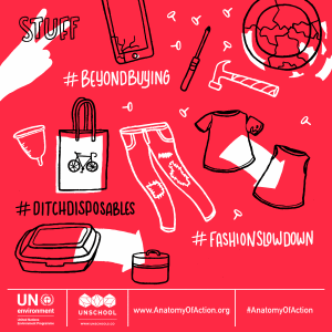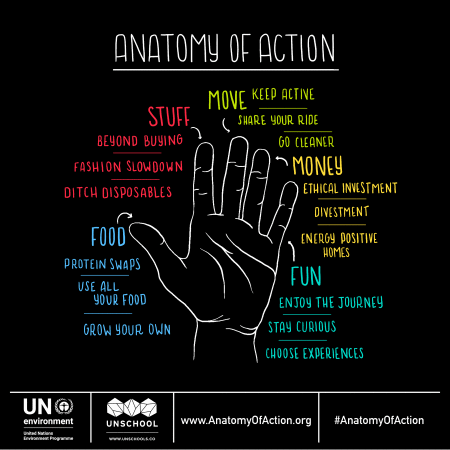 This is the foundational concept underpinning the Anatomy of Action, the initiative that my team and I at the UnSchool developed in collaboration with the UN Environment Program. Evolving out of research that we conducted, which examined the organically-building movements that support sustainable lifestyles, we then cross-evaluated our findings with the latest peer-reviewed data on which actions can have positive systemic impacts if adopted by many. These were then connected to tangible everyday actions that individuals anywhere can take.