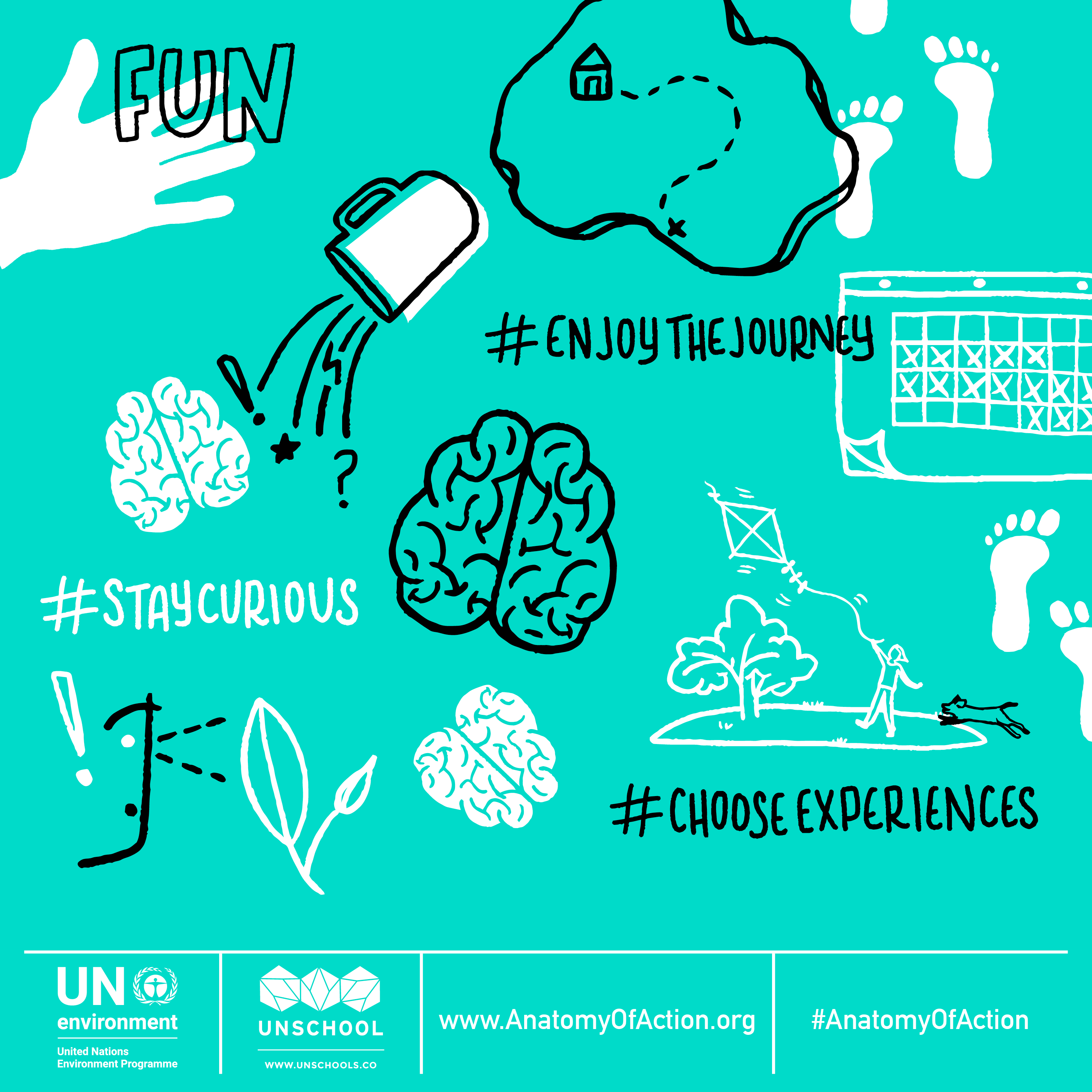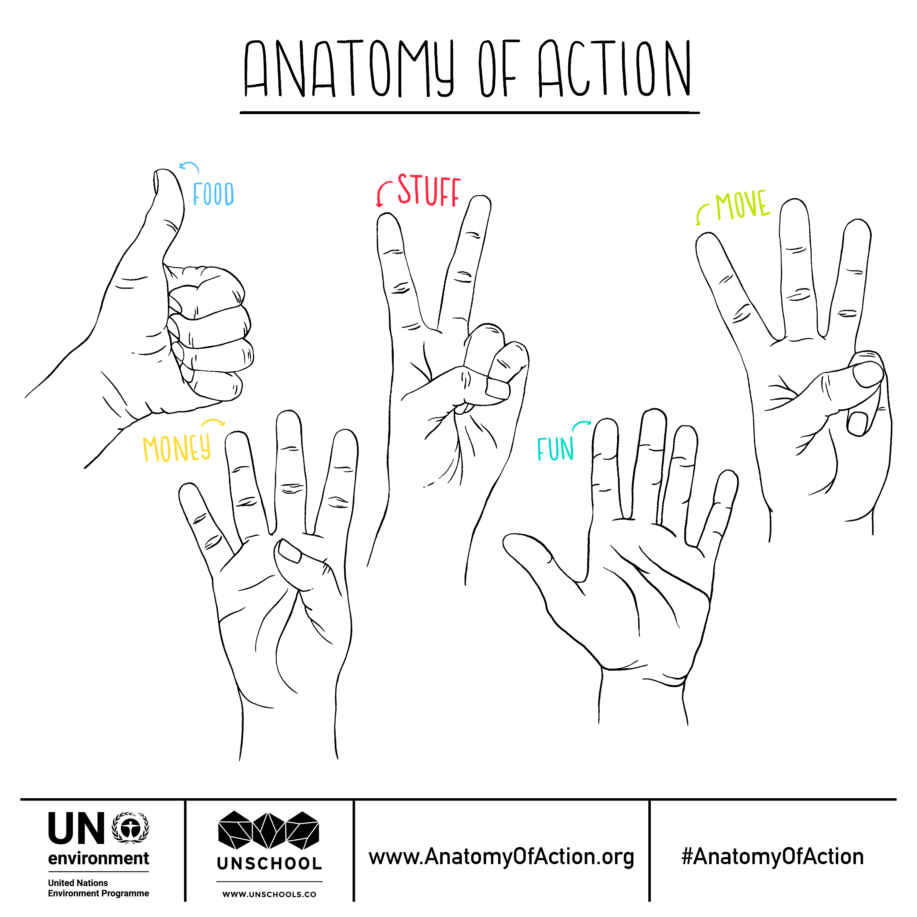 Each of us makes choices every day that impact on the world around us. Since we often use our hands to take these actions, the simple memetic concept of the Anatomy of Action is a visual reference to a hand, with each finger representing a different lifestyle area where swaps can be made: the food we eat, the stuff we buy, how we move, the ways we spend our money, and the fun things we do. Each of these five main lifestyle themes have three sub-actions that are positively focused, such as “protein swaps,” “beyond buying” and “choose experiences.” Individual changes not only help change the local and global economy (as many industries respond to consumer demand), but they also have impacts across the entire supply chain and help to normalize these new actions to others around us, creating a chain reaction of change. Moreover, many companies and governments respond to the preferences of consumers, so it can help to shift what products and services are designed and made available.
