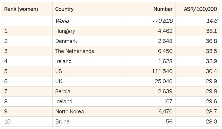 Nevertheless the table below provides a sense of where women are highly affected. The following table show the impact of lung cancer in the 10 countries with the highest rates of lung cancer and the highest number of deaths from lung cancer in 2020: