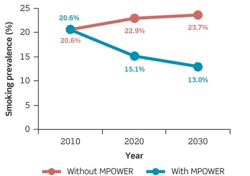 WHO has actively pursued programs to provide guidance to countries since 2008. In 2015 it launched “MPOWER” (Explanation: M: Monitor tobacco use and prevention policies; P: Protect people from tobacco smoke; O: Offer help to quit smoking; W: Warn about the dangers of tobacco; E: Enforce bans on tobacco advertising, promotion and sponsorship; R: Raise taxes on tobacco).