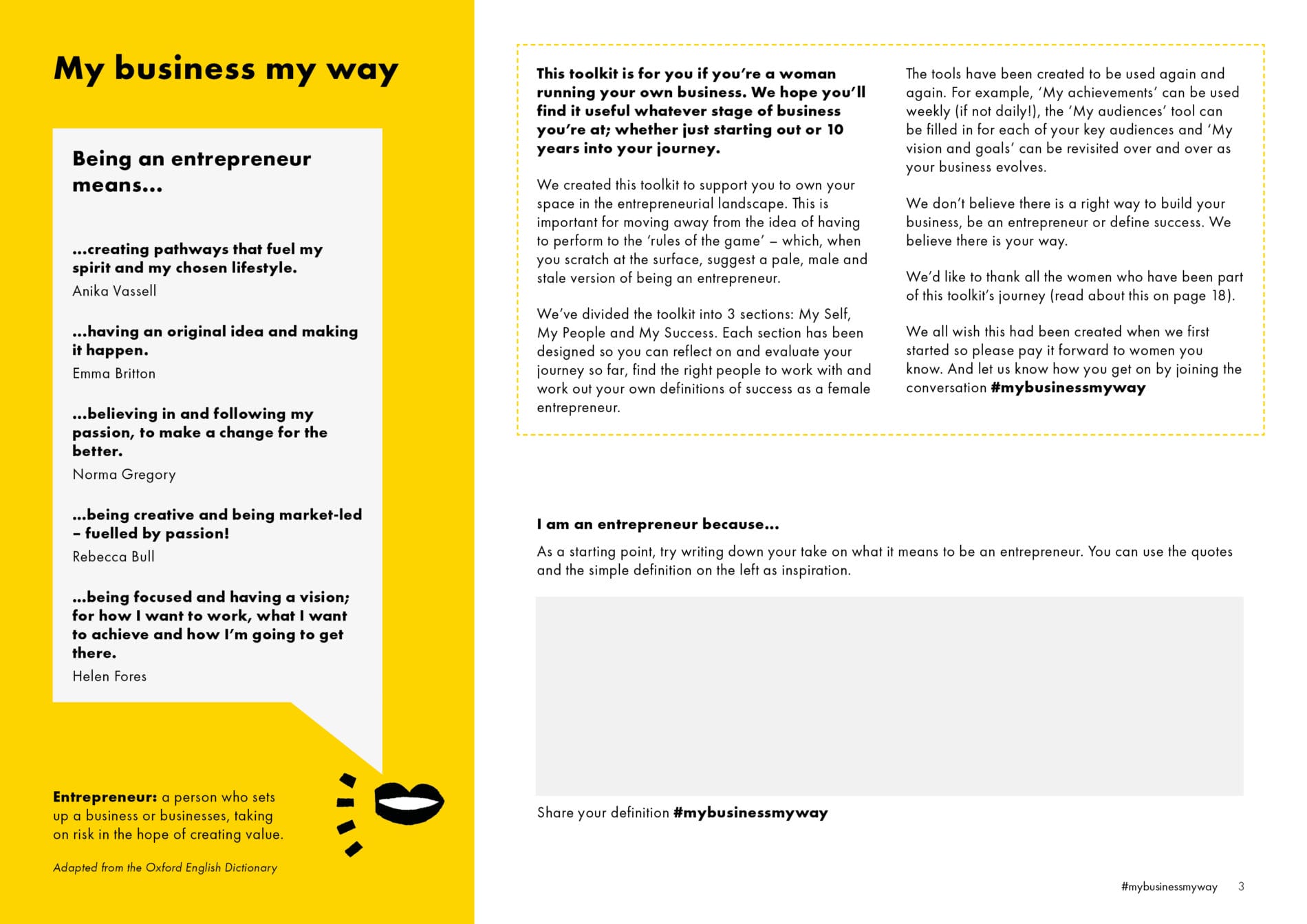 Alexandra Hardwick, owner of creative agency Line and Dot Creative was part of this project team. Her many years of working as a graphic designer made her a key player when it came to developing the interactive exercises, the flow of the pages and critically, the overall design and feel of the toolkit. She quotes ‘throughout the project, I always had at the front of my mind an entrepreneur’s most limited resource – time. I wanted the toolkit to be easily accessible to everyone, not too copy heavy and with interactive questions and prompts to guide the entrepreneur. I picked yellow as the key colour to represent positivity, clarity, energy and optimism, and we captured the diversity and essence of the modern business woman by using photographs of real female entrepreneurs from the focus groups.’