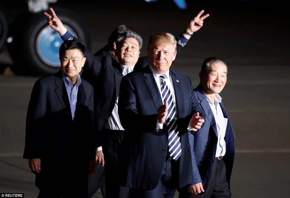 In the Photo: Trump greets the three released Americans, Kim Dong Chul, Kim Hak Song and Tony Kim at Andrews Air Force Base outside Washington at 2 am on and he thanked the North Korea leader for freeing “the folks early”. Credit: Reuters
