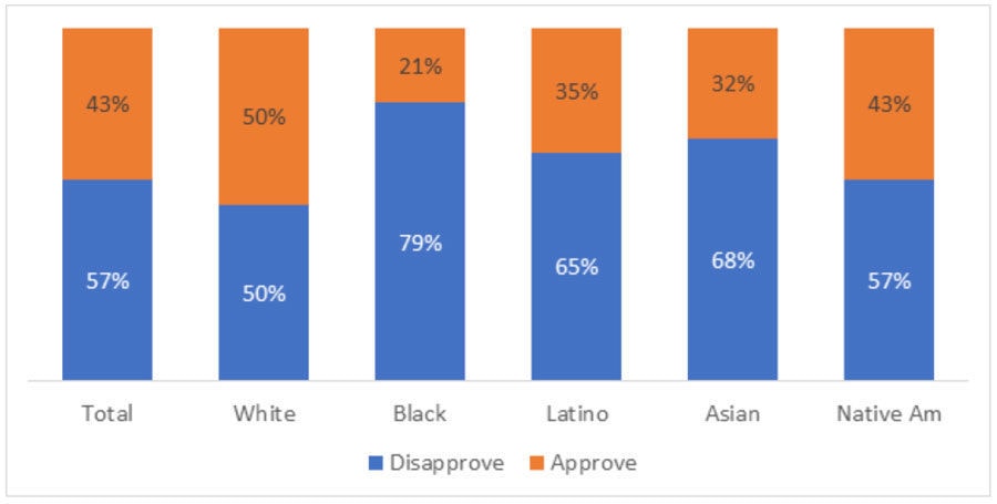 - An extremely low level of support, much lower than whites for all voters of color. Trump’s approval numbers are clearly underwater and for no racial/ethnic group of voters surveyed does he have majority approval: