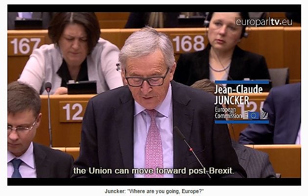 Screenshot of EU President Juncker delivering his speech to the EU Parliament on March 1 to present his White Paper (Source: http://www.europarl.europa.eu/news/en/news-room/20170301STO64425/future-of-europe-meps-debate-the-five-scenarios-outlined-by-the-commission)