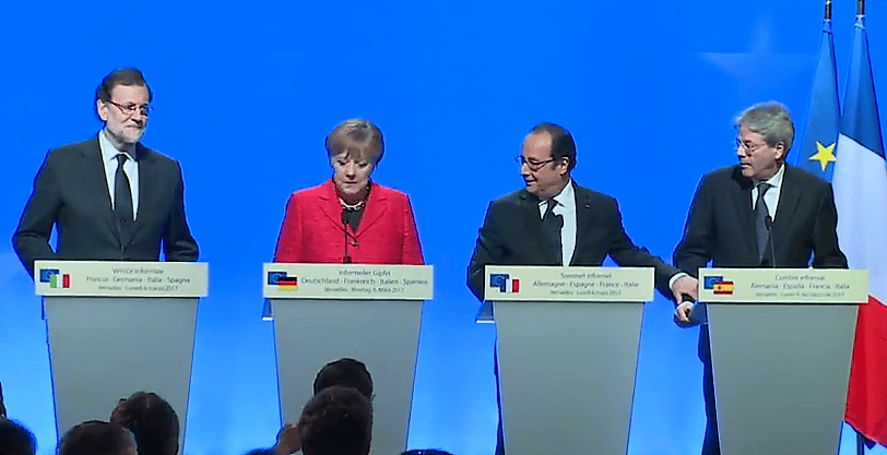 In the Photo: Four Leaders at the Versailles mini-summit, March 6 2017 Press conference: Starting from left, Rajoy (Spain), Merkel (Germany), Hollande (France) and Gentiloni (Italy). Note the mistake as they moved in, it was quickly corrected. Gentiloni and Rajoy are standing behind each other’s desk, at that moment Hollande became aware of it and grabbed Gentiloni’s arm. – Photo Credit: screenshot from video of conference Youtube
