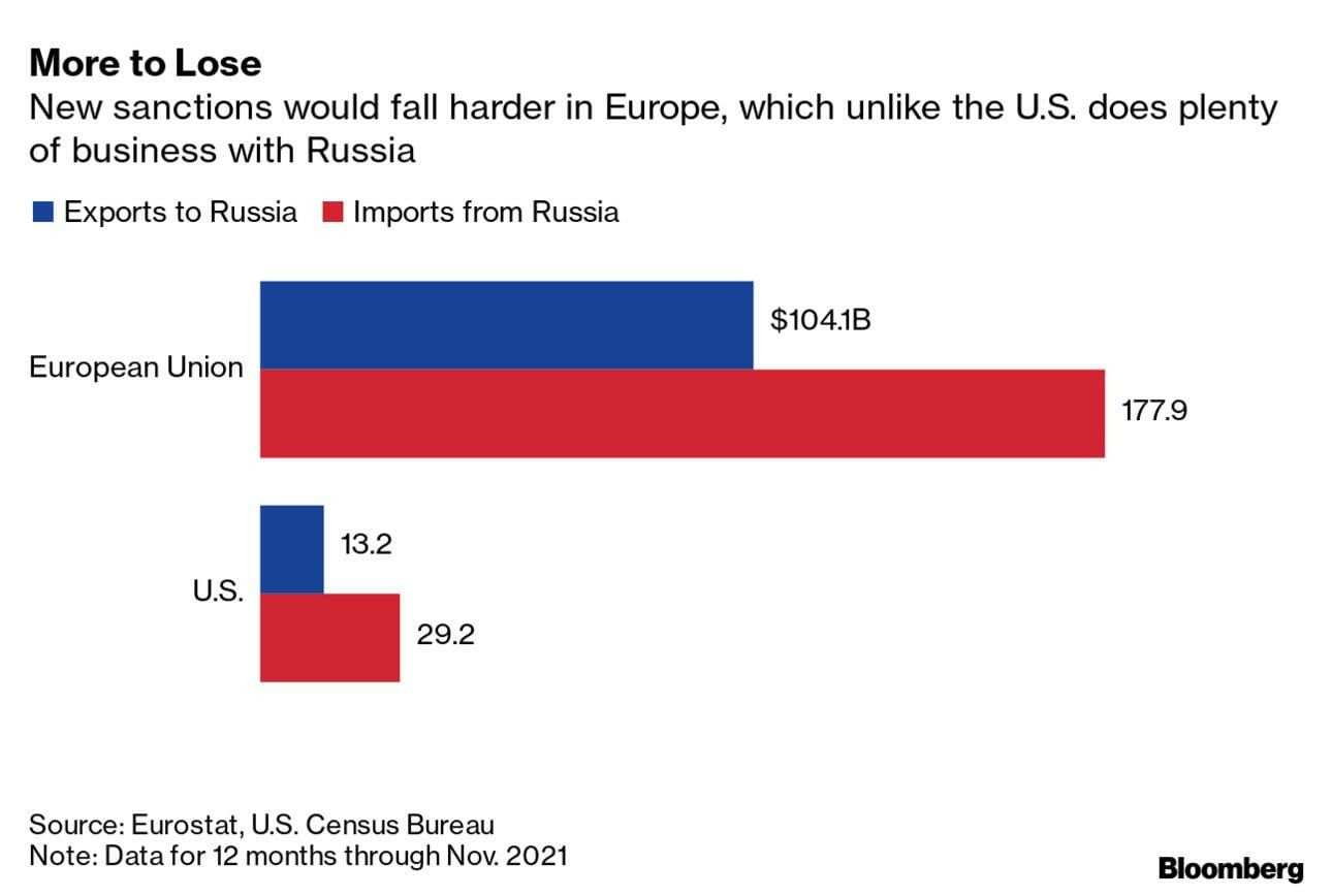 Nobody in Europe really welcomes America’s leadership in this case, seeing it as a form of meddling that could lead Europeans to be forced to take dangerous sanctions – sanctions that are far more damaging to Europe than America as Europeans are far more exposed. They are highly dependent on Russia’s gas and oil and heavily trade with Russia, much more than the US as this diagram clearly shows: