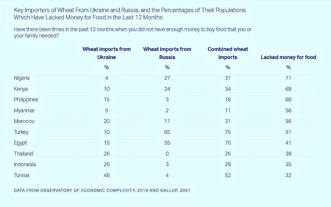 Staple grains supply the bulk of the diet for the world’s poorest. Higher prices threaten to place a significant strain on poor countries like Bangladesh, Sudan, and Pakistan, which in 2020 received roughly half or more of their wheat from Russia or Ukraine – and as shown in the above table, particularly in Egypt and Turkey, which imported the great majority of their wheat from those combatants.