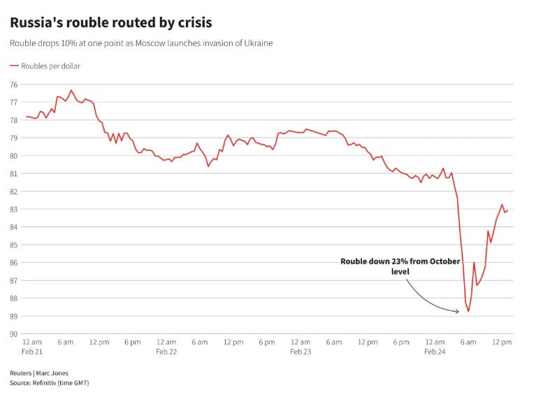 Russia’s markets, in fact, were roiled as the rouble weakened nearly 7% to an unprecedented 86.98 per dollar and there were record 40% falls on the Moscow stock exchange (.IMOEX). Trading was suspended early on. Russia and Kyiv’s central banks tried to step in but with relative success so far.