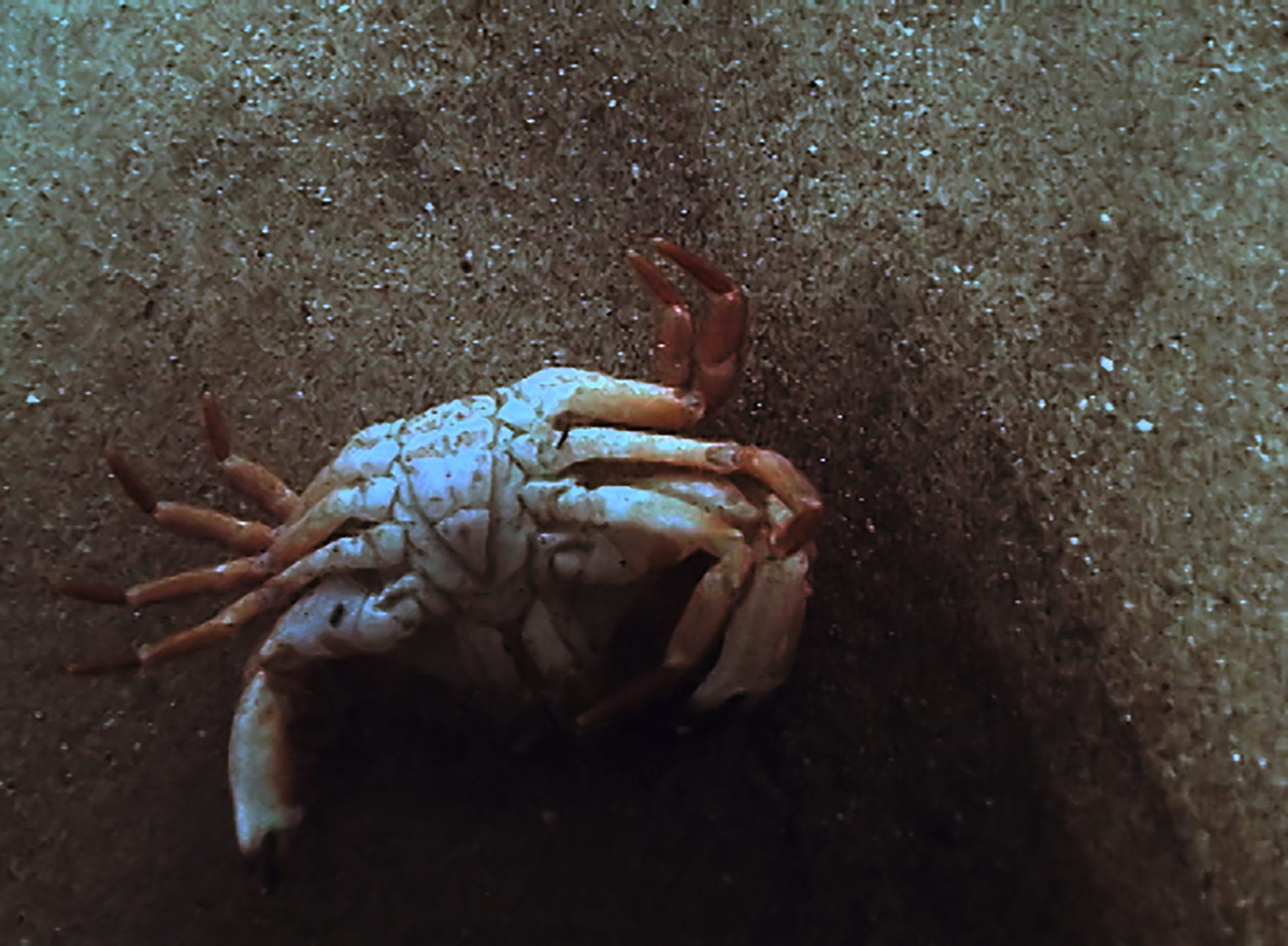 In the photo: A dead crab floating along the sea bed. Image Credit:Joel Tauber, “Death”, video still from UNDERWATER