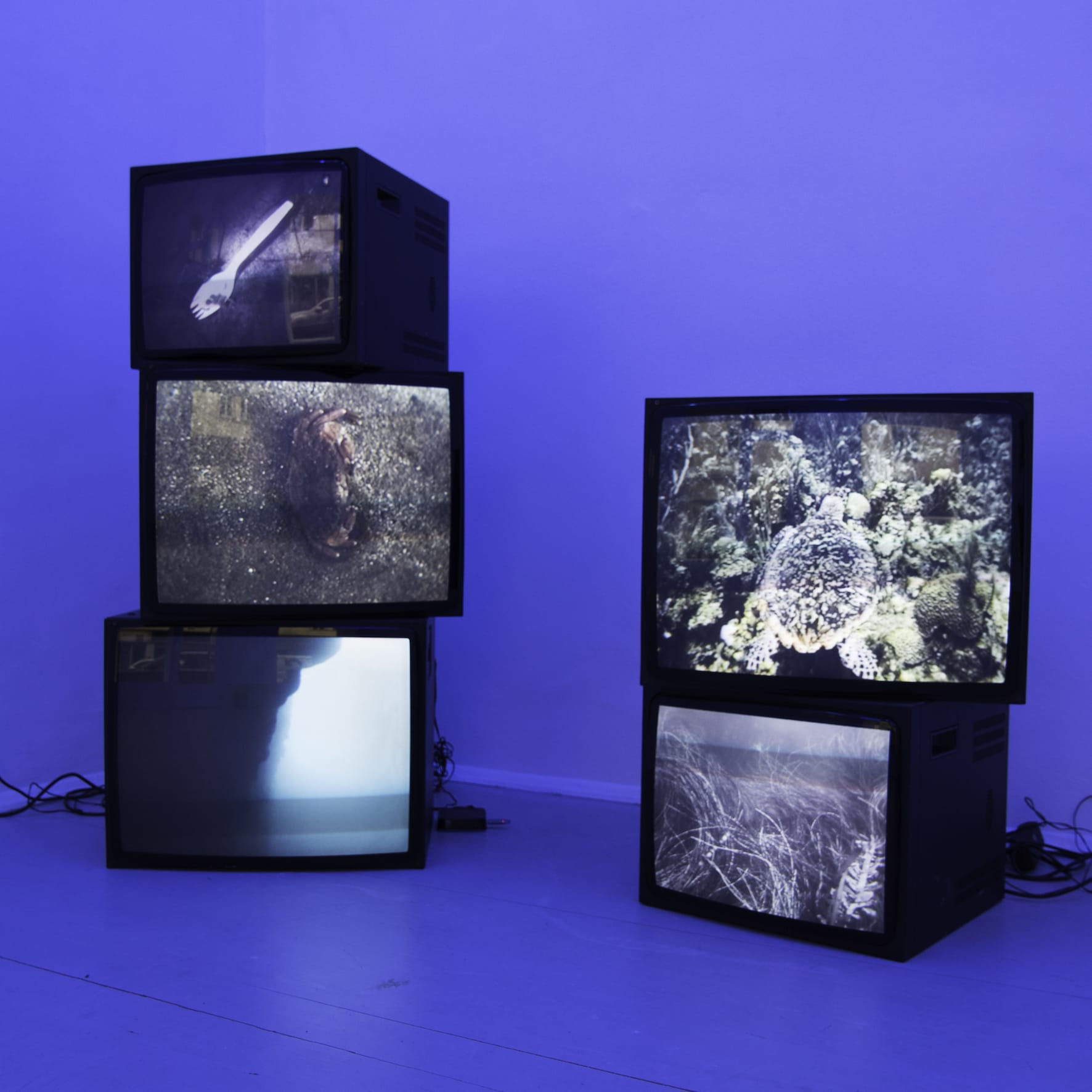 In the photo: Screens of the underwater video installation. Image credit: Joel Tauber, UNDERWATER installation at KOENIG2 by_robbygreif (installation photo: Masha Sizikova)