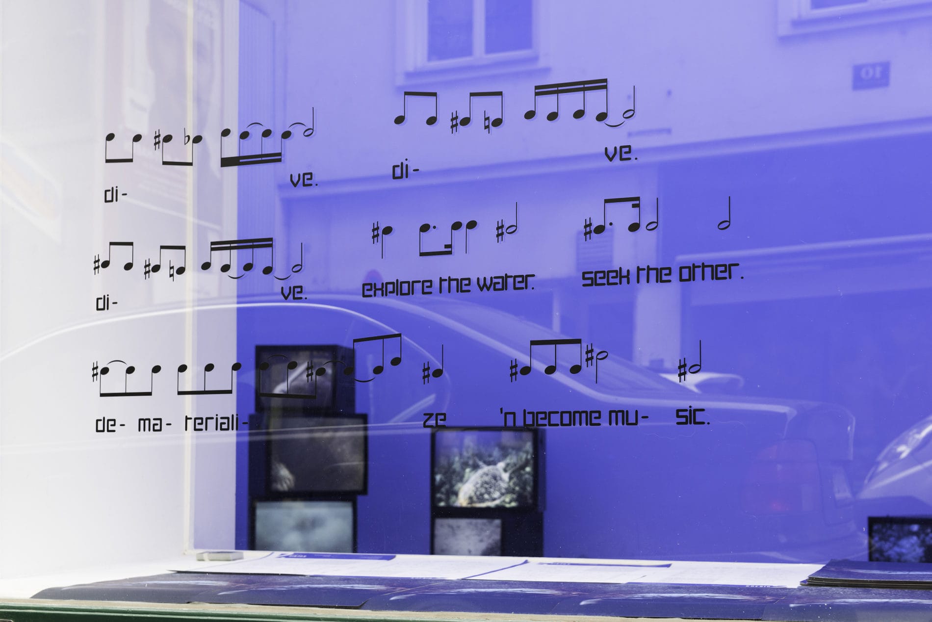 In the photo: Images of the underwater video installation and the one of the songs to go along with it. Image credit: Joel Tauber, UNDERWATER installation at KOENIG2 by_robbygreif (installation photo: Masha Sizikova)