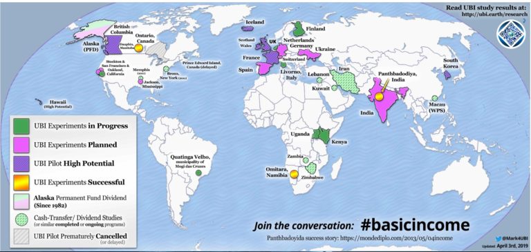 Fai Ku Lee’s reassuring words notwithstanding, people are in a panic. There is a plethora of UBI experiments around the world, as this map (updated to 3 April 2019) illustrates: