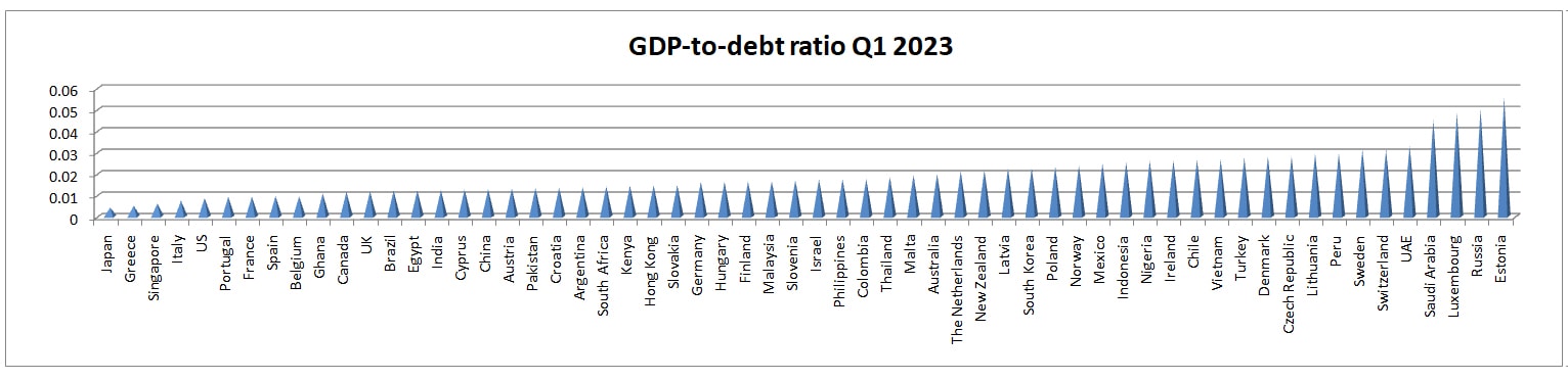 This landscape reveals the top five on the right: Estonia, Russia, Luxembourg, Saudi Arabia, and the United Arab Emirates. Meanwhile, debt-laden behemoths backslide into the valley on the left, with Japan in the last position, reflecting the recent devaluation of the yen and bankrupting USA close behind.